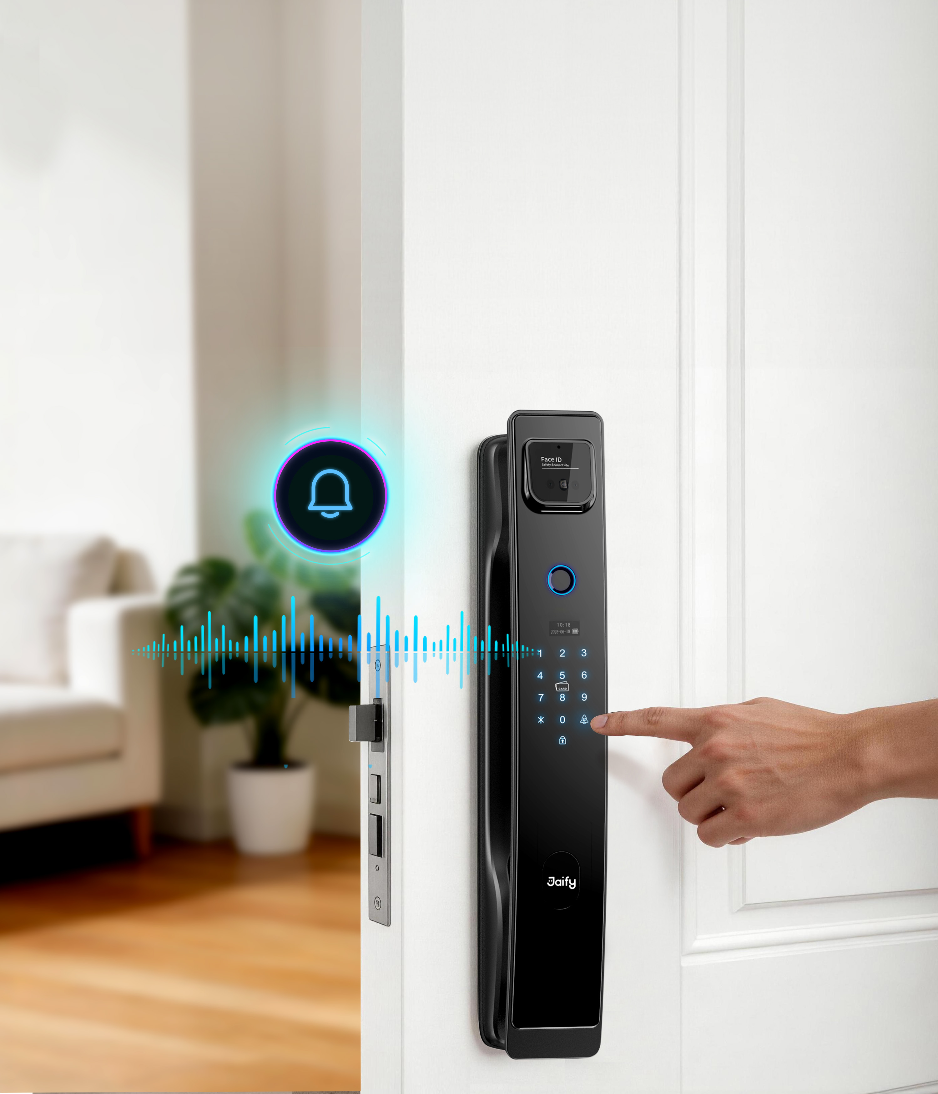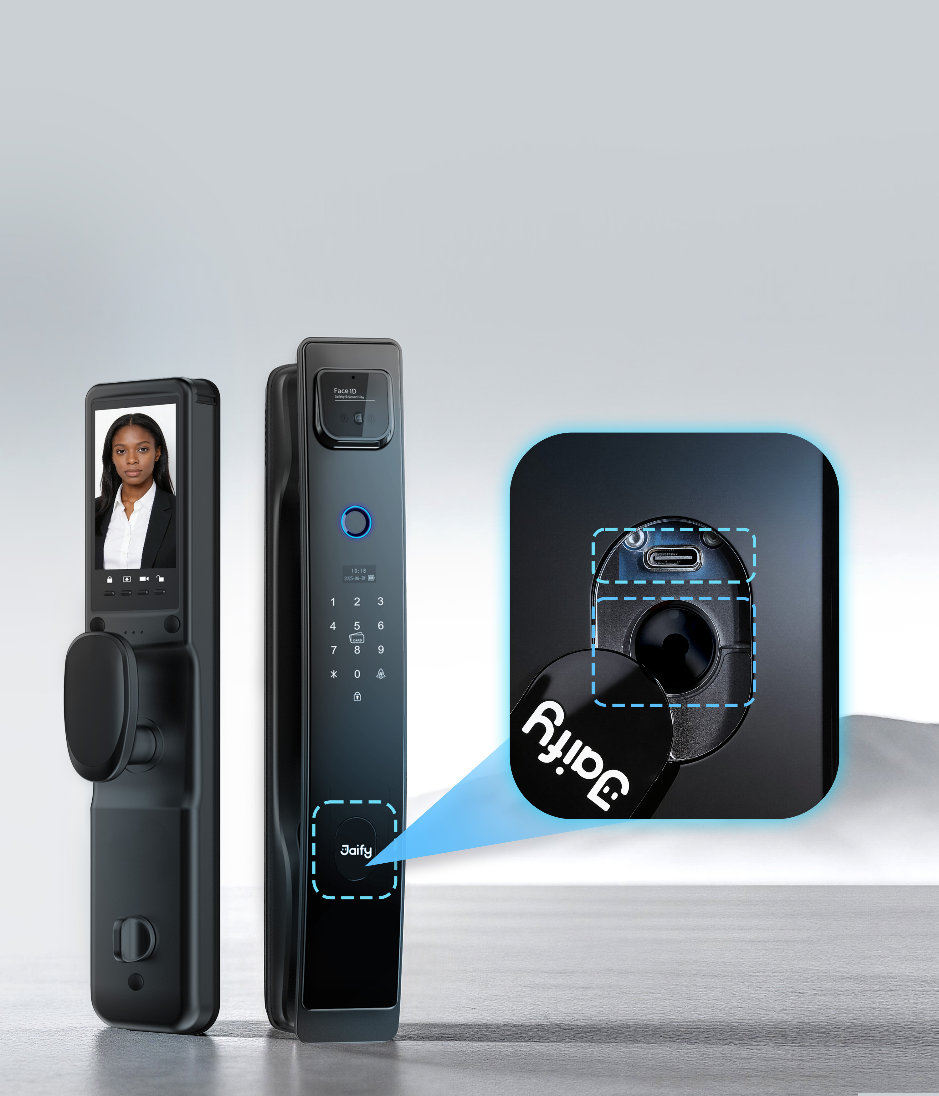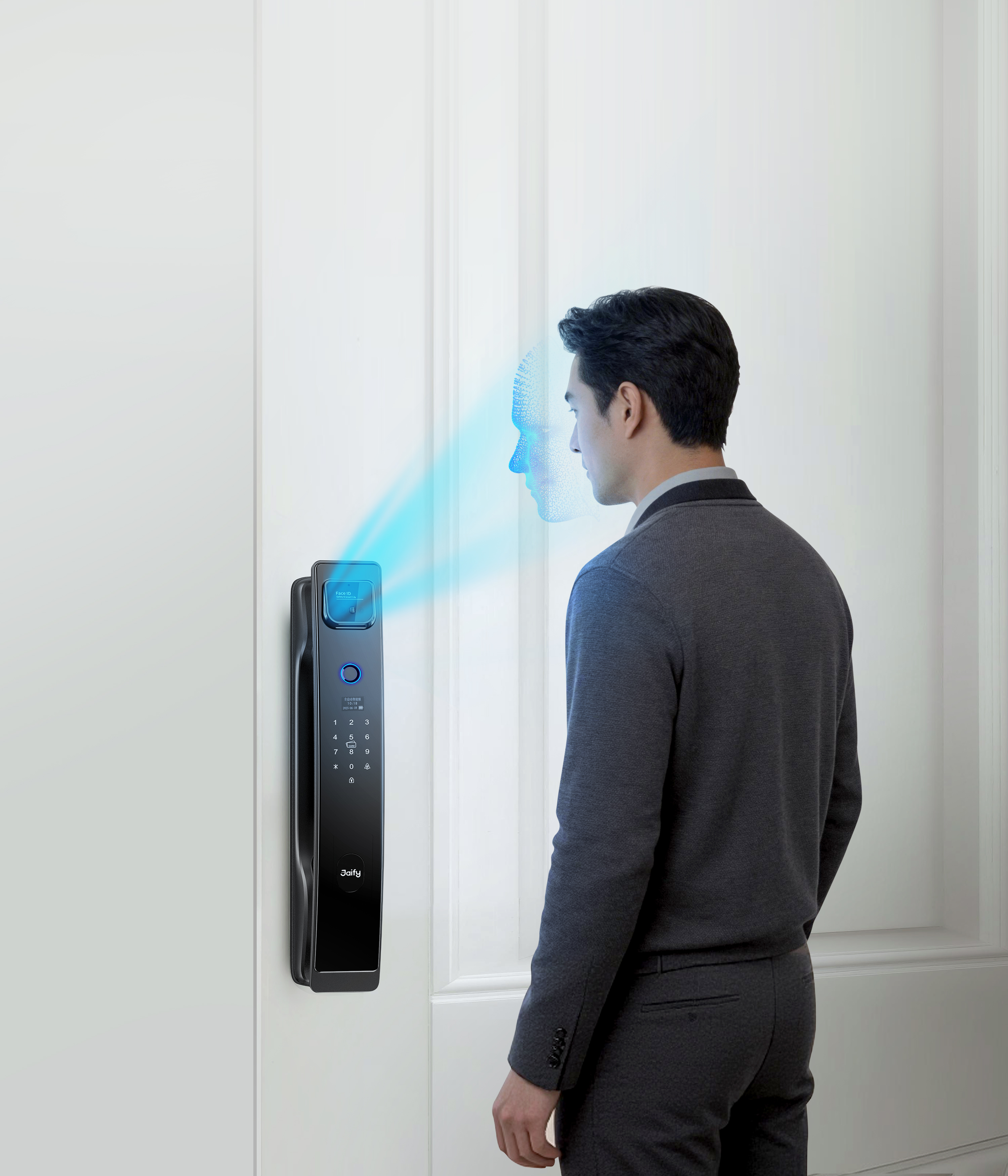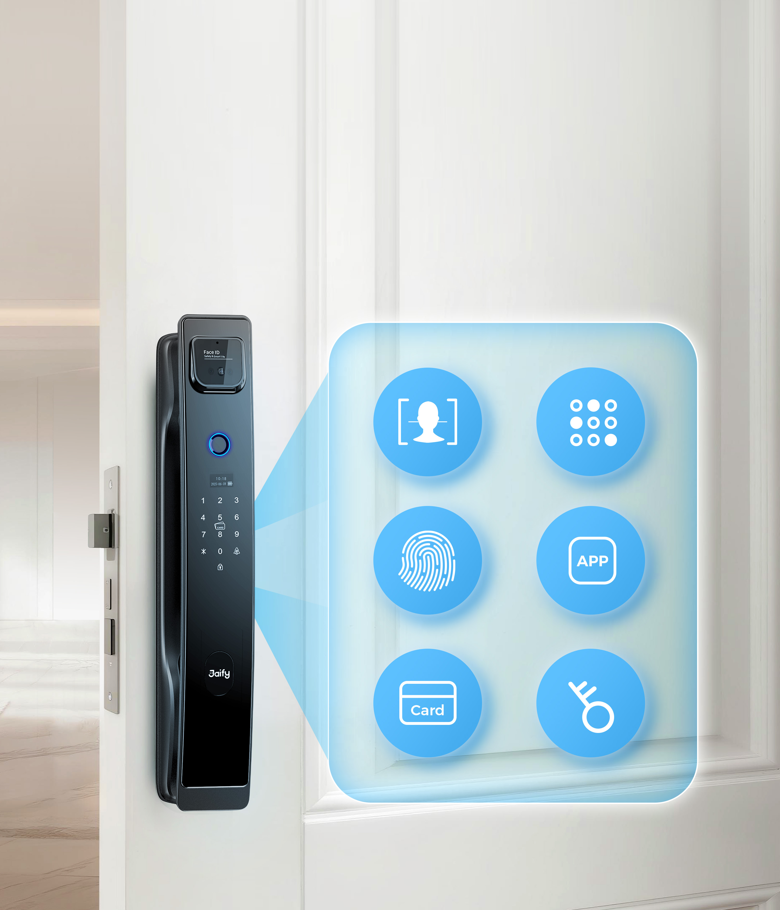 Unlock Methods: Face recognition, fingerprint, card, passcode, temporary passcode, remote unlocking via JAIFY app, emergency key