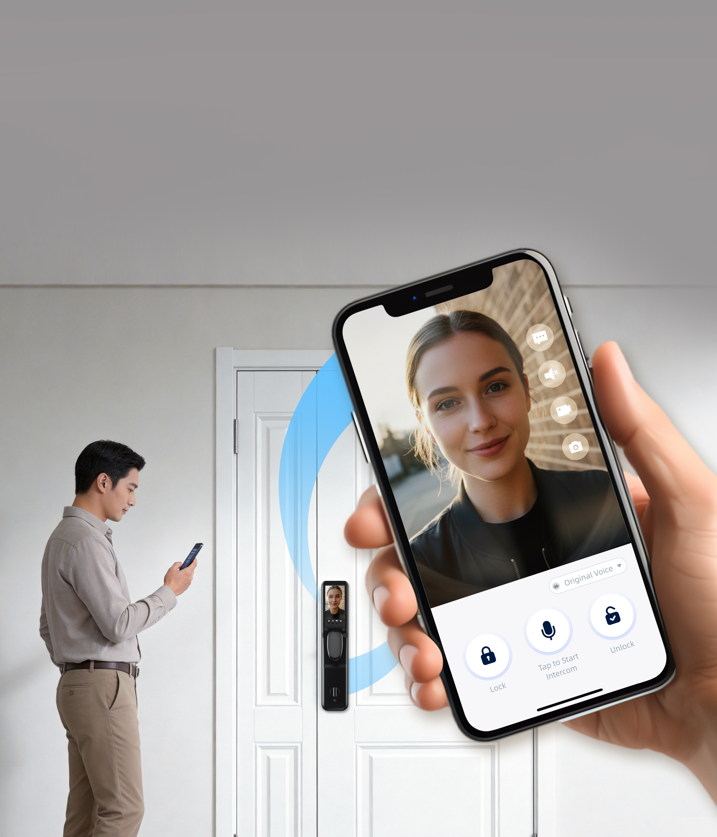 Calling: Touch-sensitive electronic doorbell; one-touch call via doorbell button; app allows you to set voice-changing intercom